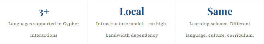 Cypher's multilingual capability — it communicates through audio and responds in audio, making it accessible across India's diverse linguistic landscape — proved directly transferable. The platform's ability to function on local infrastructure rather than requiring high-bandwidth cloud connectivity was equally important. This is precisely the reason our Matrix sovereign AI infrastructure product was designed — to give schools the AI capability they need without depending on external cloud providers that may not have reliable reach in their geography.