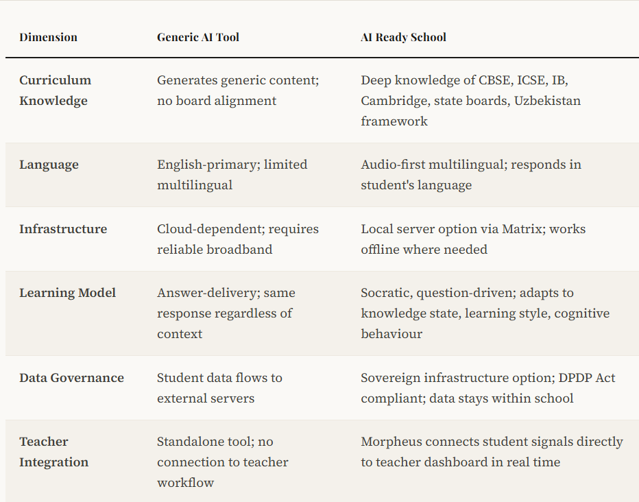 It is the right question. A government school in Raipur and an IB school in Hyderabad are not the same institution. They serve different students, operate on different boards, run with different infrastructure levels, and measure success against different outcomes. An AI platform that works beautifully in one and fails in the other has not solved the problem of AI in education. It has solved the problem of AI in one type of school — which is a far smaller achievement than it sounds.