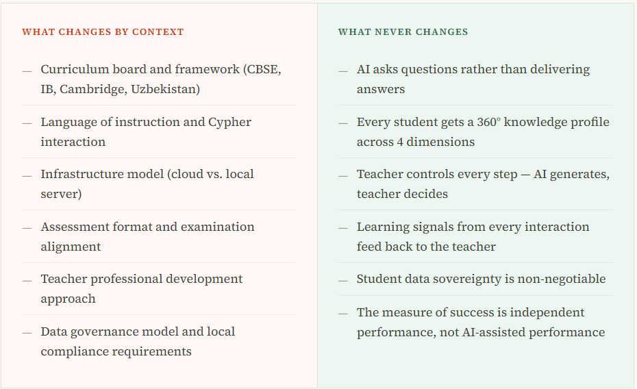 Third, a pedagogy that works regardless of context. The Socratic method — asking questions that lead students to construct understanding rather than receive it — works in Grade 7 Maths in Raipur and in IB Chemistry in Hyderabad and in Uzbekistan secondary school Physics. The learning science behind how the brain actually learns does not vary by geography. A platform built on that science travels.