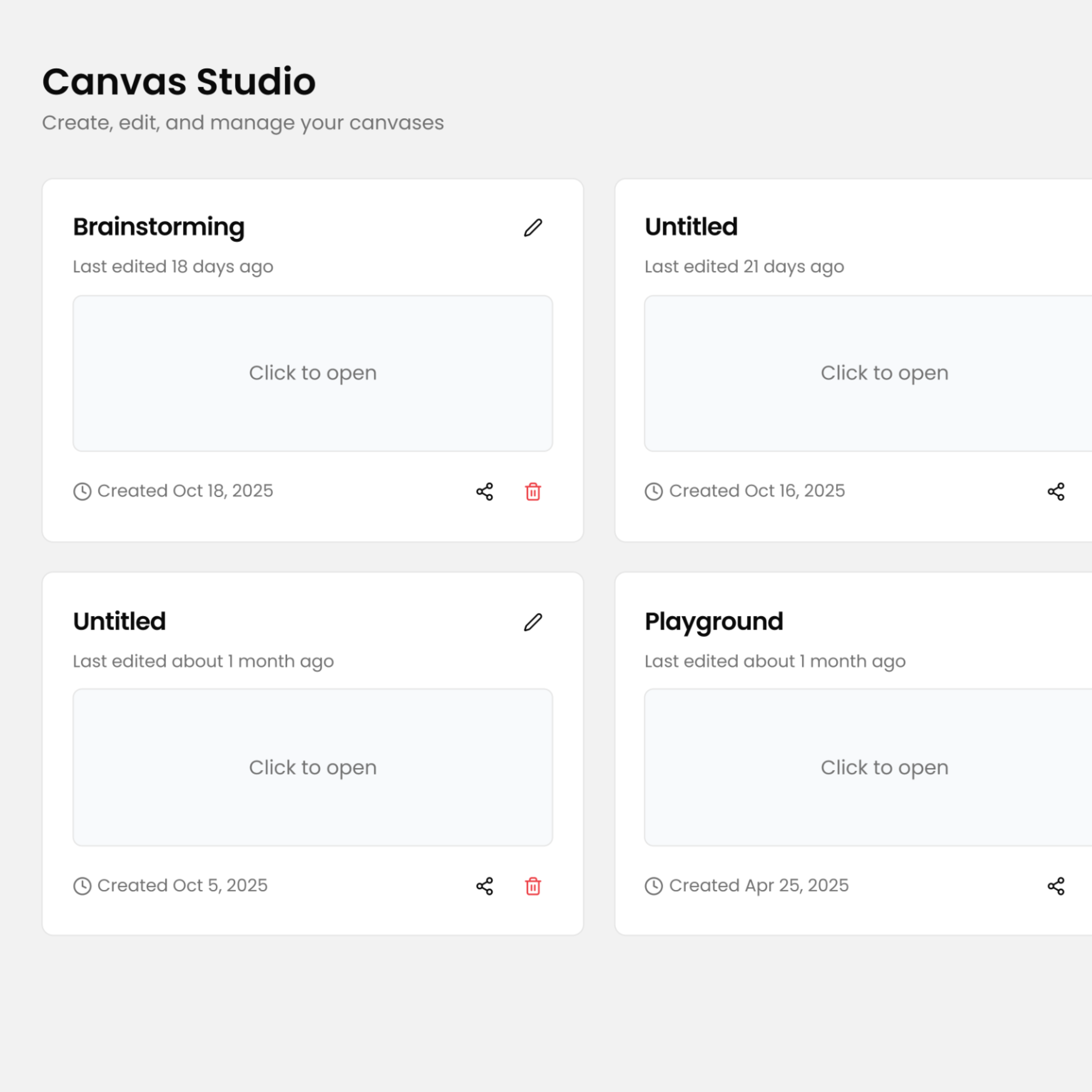 View your saved canvases with timestamps and last-edited details. Click to open and continue where you left off