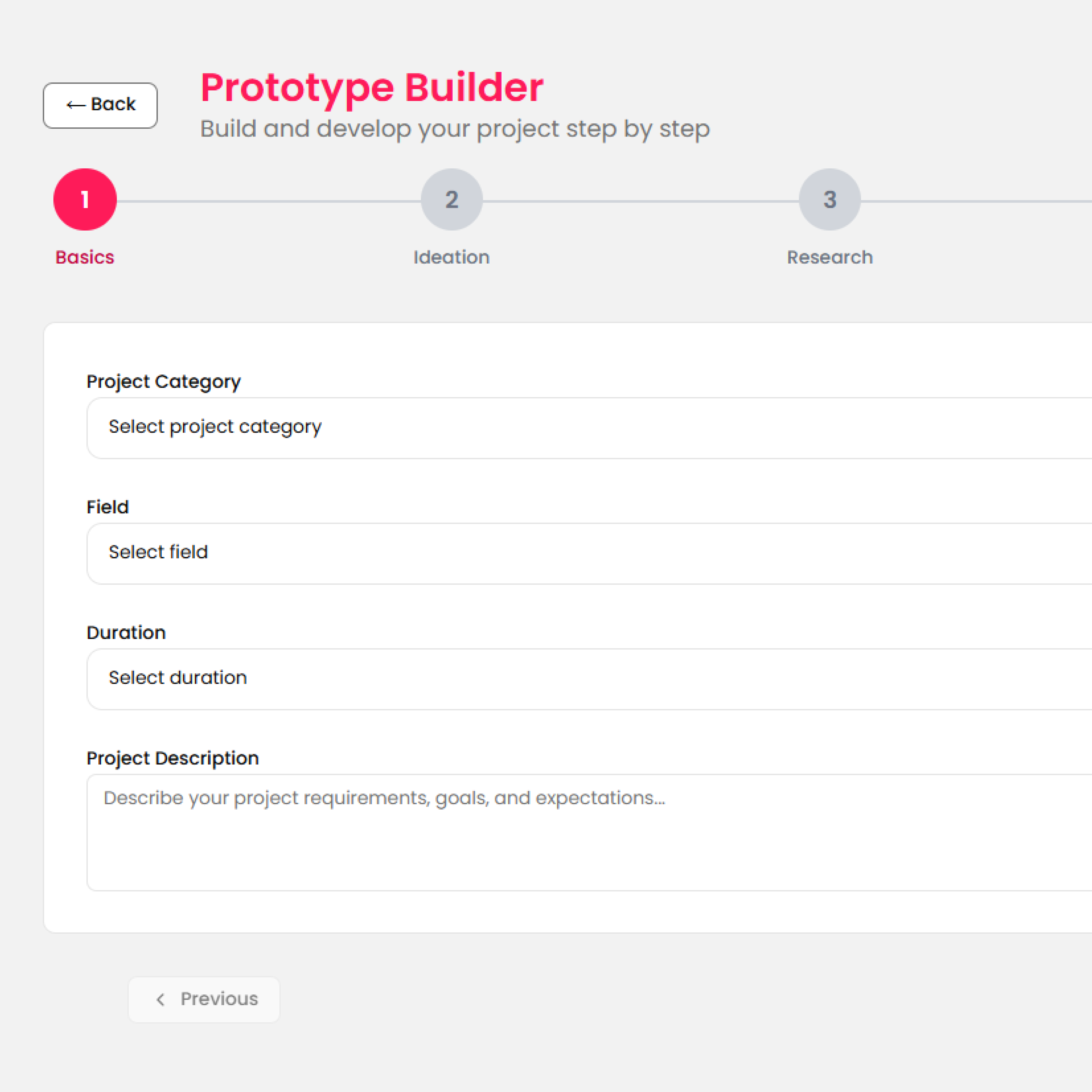Follow a guided 7-step flow to define your project, document your research, and build a functional prototype.