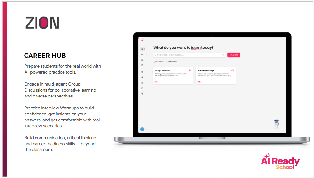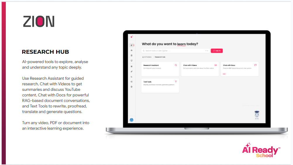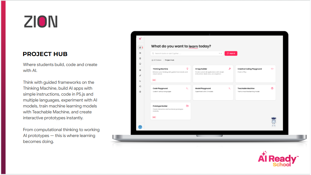 Zion is AI Ready School's integrated AI tool suite for K-12 students and teachers. It brings 30+ purpose-built tools together under one platform, one login, one data policy, one safety architecture, and one activity signal that feeds directly into the rest of the AI Ready School ecosystem. The platform is organised into four hubs, each designed for a distinct mode of student engagement with AI: the Learning Hub, the Creative Hub, the Research Hub, and the Project Hub.