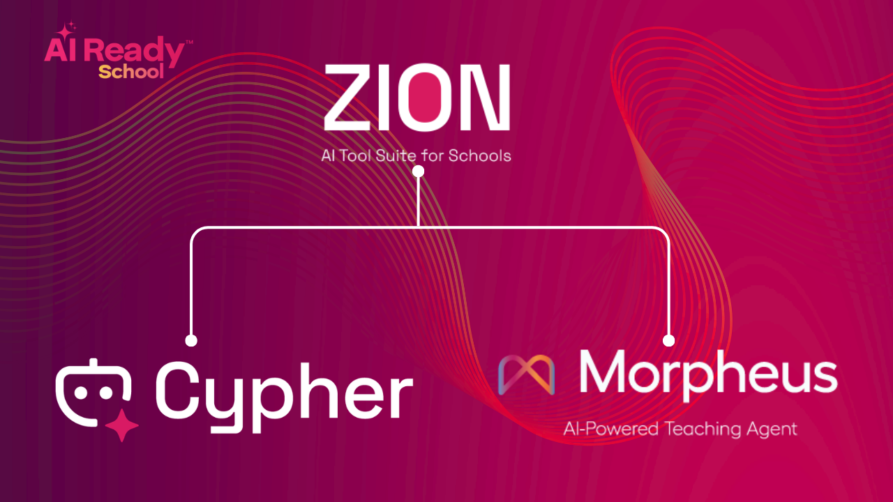 AI Ready School provides a complete AI ecosystem for K-12 schools, including Zion (safe AI tool suite), Cypher (personalised learning companion), Morpheus (AI teaching agent), NEO (AI Innovation Labs), and Matrix (sovereign AI infrastructure).