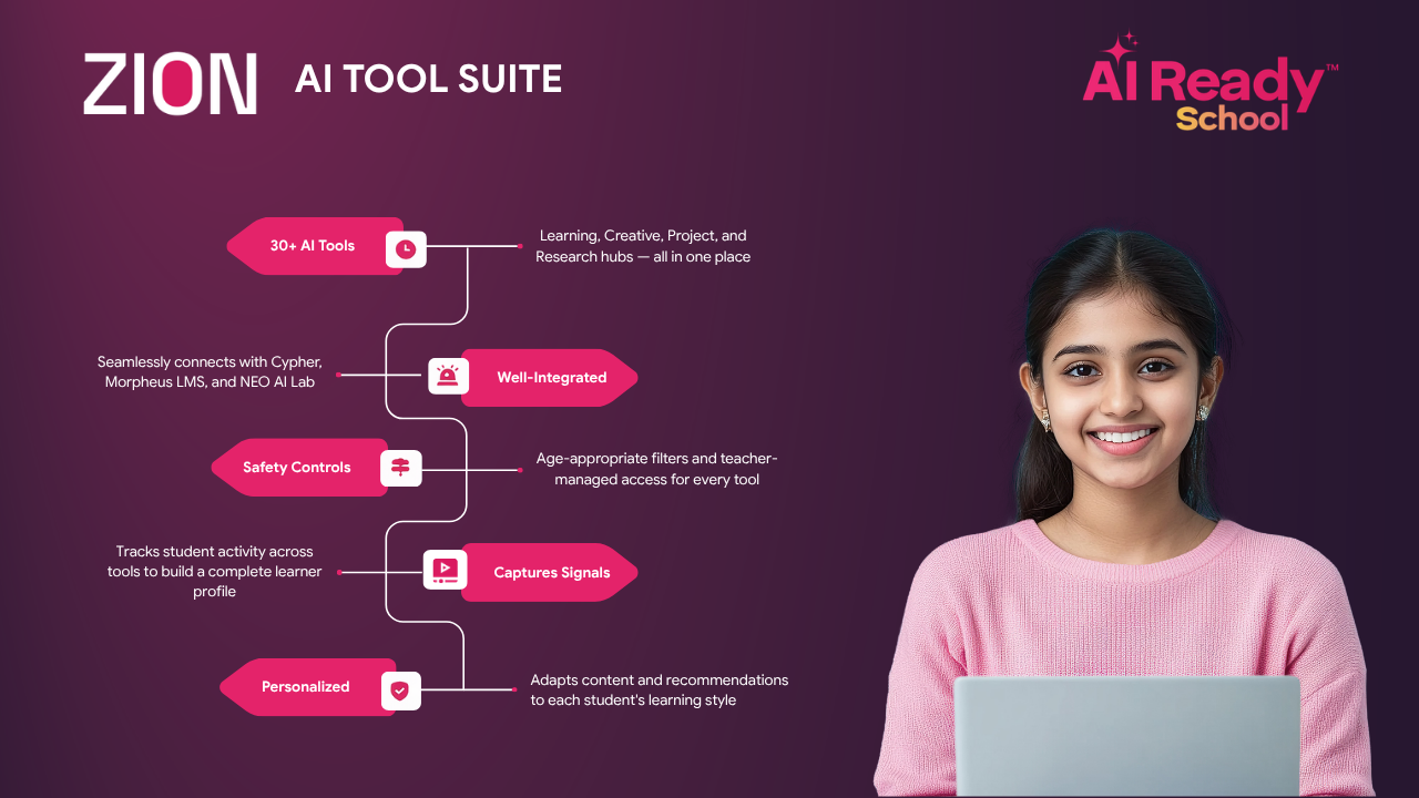 Zion satisfies every one of these criteria. Not because it is the most powerful tool in every category. Because it is the only platform that integrates 30+ tools under a single K-12 safety architecture, connects every student activity signal to the teaching and learning ecosystem through Cypher and Morpheus, builds AI literacy at every level through the Learning Hub, Creative Hub, Research Hub, and Project Hub, and gives school management the visibility they need to make evidence-based decisions about AI in their institution.