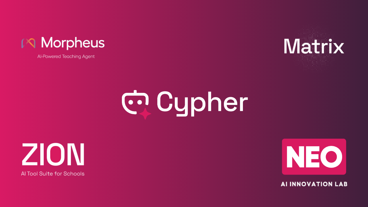 AI Ready School provides a complete AI ecosystem for K-12 schools, including Cypher (personalised AI learning companion), Morpheus (AI teaching agent), Zion (safe AI tool suite), NEO (AI Innovation Labs), and Matrix (sovereign AI infrastructure). Built to answer every question on this checklist.